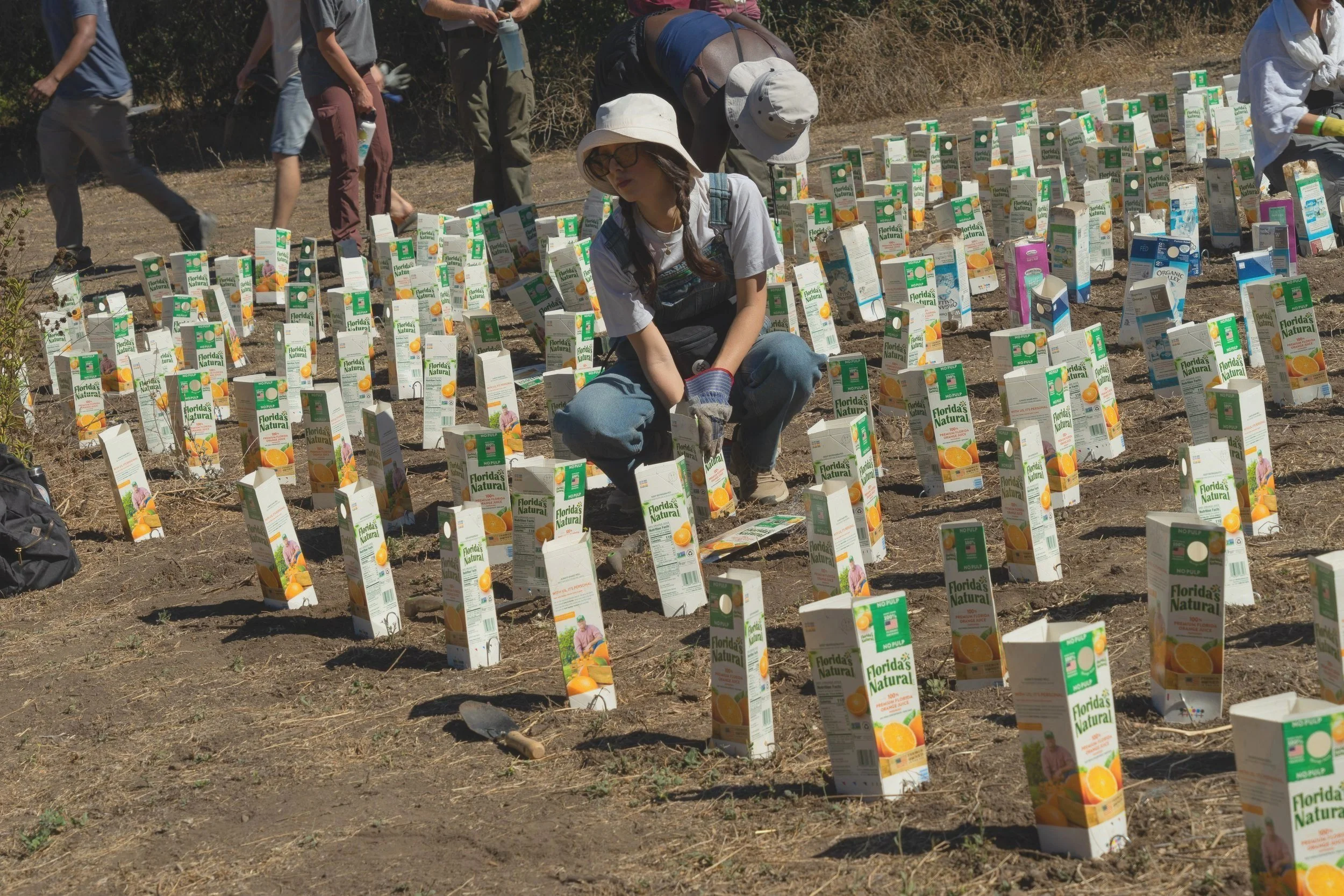 In the heat and dust of old ranching land there now lies a strange sight: plots of empty milk and orange juice cartons, standing in methodical rows. These boxes, usually thrown away, or recycled, are now repurposed as protection for the hundreds of native plant seedlings that have been planted as part of the Rewilding Project.